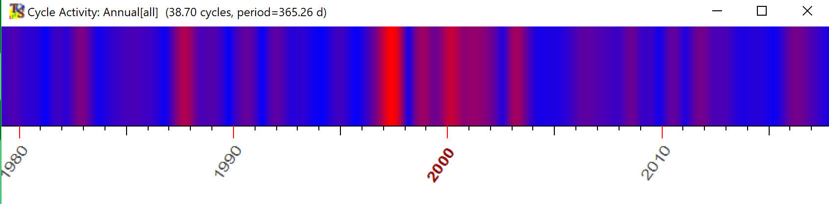 The red regions there show the periods when Annual cycle was strong, while blue regions are periods when Annual cycle was weak. As you see, Annual cycle was strong since 1997 up to 2002 (S&P 500 index was analyzed).