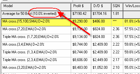 This module searches the most tradable strategies for any financial instrument. Of course it allows to find the optimal moving averages crossover for that instrument. In our example for DJI, it examines more than one thousand strategies based on different moving averages and shows the statistic information for the first 50 most profitable ones. Here it is:
