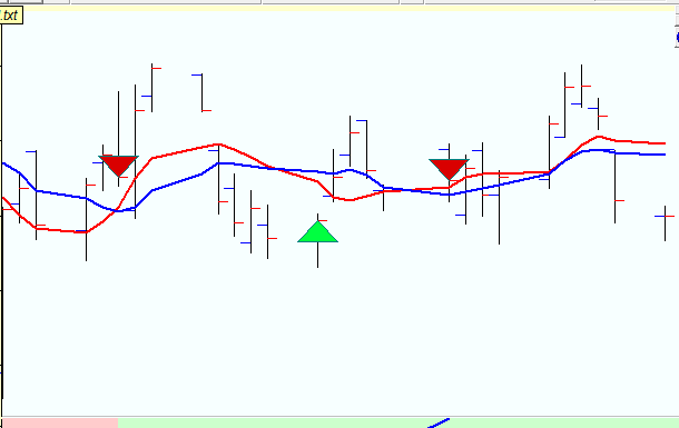 Here the program generates a buy signal when the fast (red) moving average crosses the slow moving average (blue) from down to up; vise versa a sell signal is generated on up to down crossover. The logic of this trading system is pretty obvious, it consists of two steps: