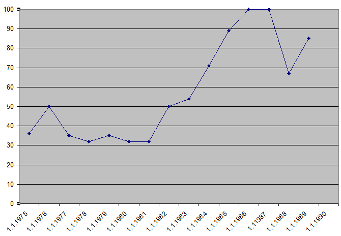 Now the question arises: when exactly and why this "return to averages" strategies have happened? I have calculated a more detailed diagram for this index covering 1975-1990 years: