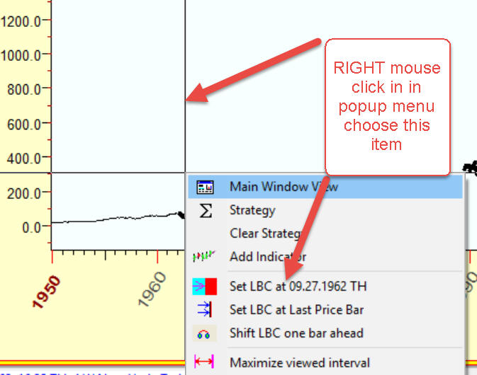 4) Dividing the price history in two intervals: training and testing intervals We use Learning Bored Cursor (LBC) to divide the price history in two intervals: training price history prior LBC and testing after LBC. You can easily set LBC with the right mouse click and choosing this item in the pop-up menu:
