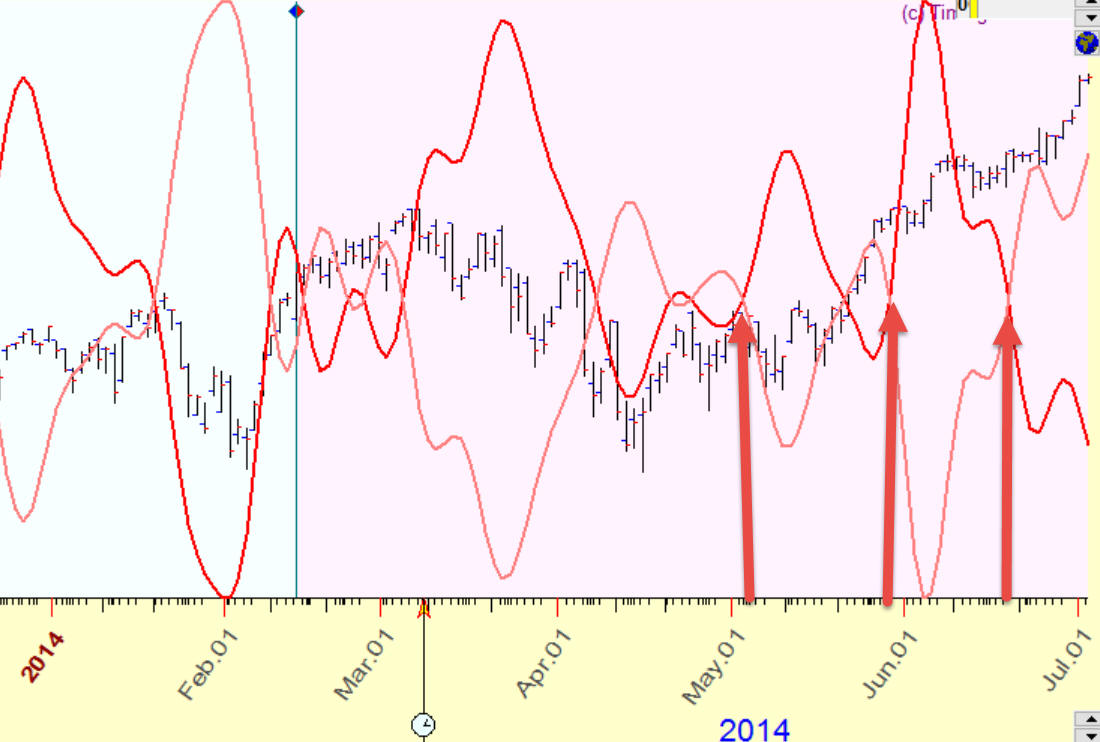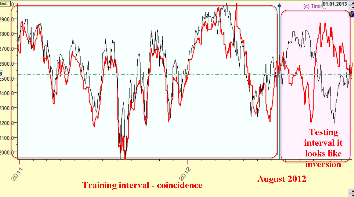So finally we get a good coincidence between the price and the INVERTED projection line after August 2012, though a cost of that is an inverted coincidence on the training interval, prior August 2012.