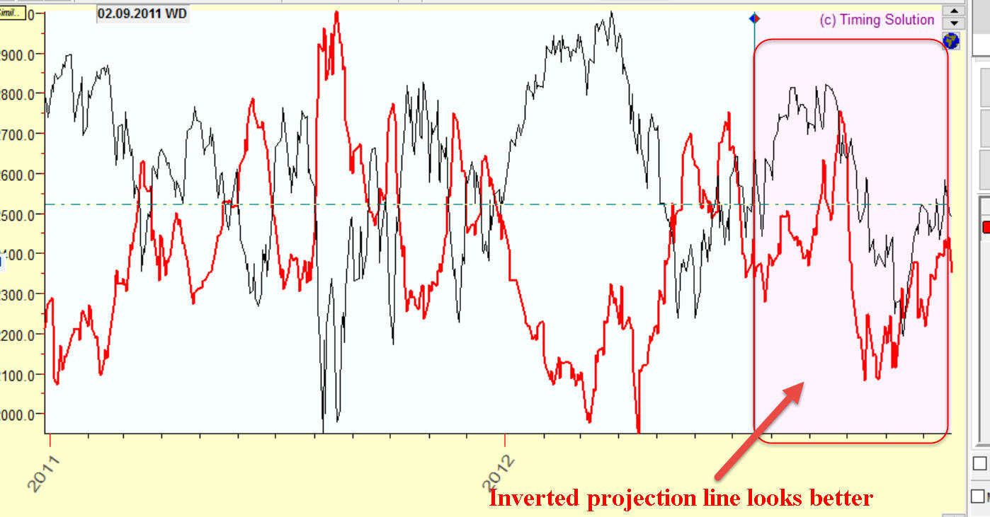 Any moment the real price movement can switch from one (inverted) to another (normal) projection line, and vice versa. I have marked these dates in the screenshot above.
