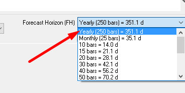 To get more reliable picture, I would recommend to conduct Walk Forward Analysis for this model. De facto it conducts the procedure explained above several times, this amount we call a sample size (SZ). The interval of two years that we used to calculate the correlation is called Forecast Horizon (FH). It should be long enough to provide a variety of data. Typically as Forecast Horizon we can use the period of the most typical cycles. For Annual cycle it would be one year, for Moon cycle - one month. In this example we can apply one year FH as well, within this interval this model still provides enough variety of data.
