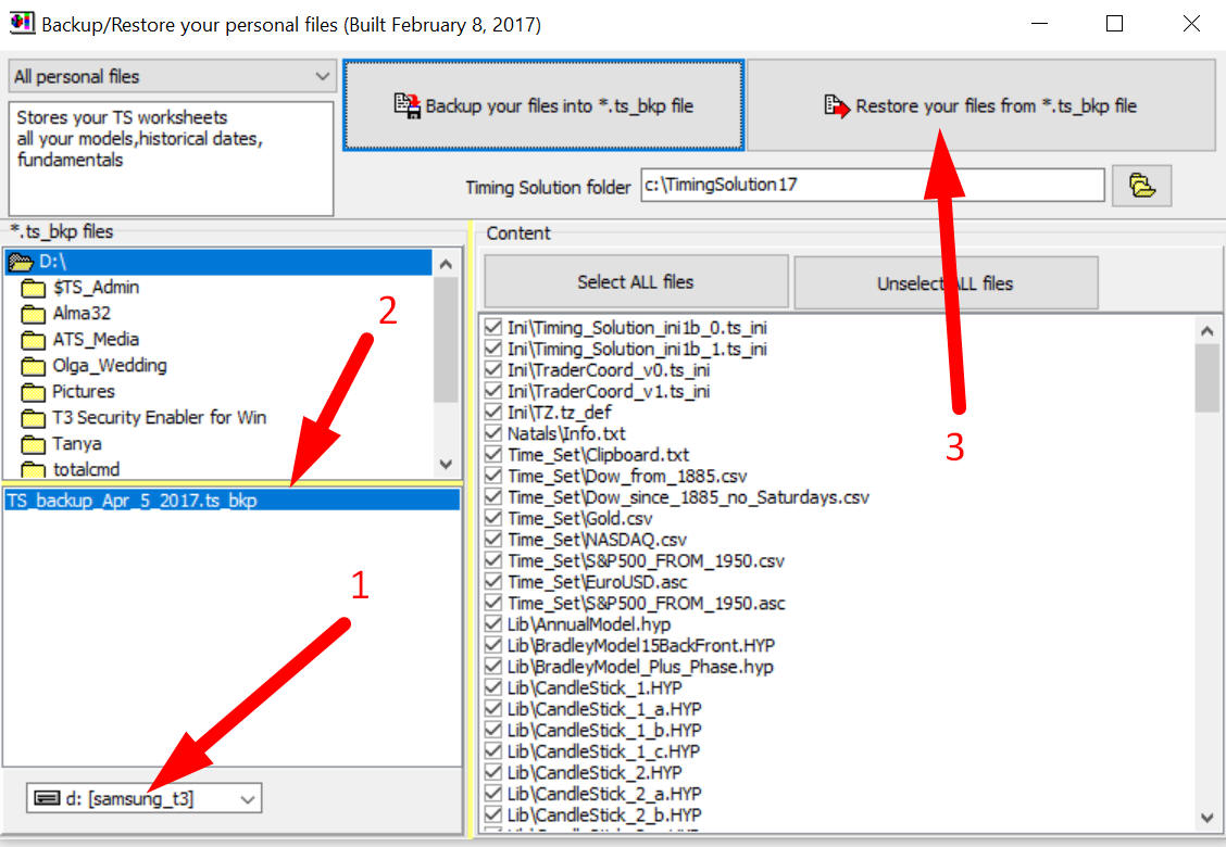 6) The last steps are: plug storage device with your NEW computer, run TS Backup utility on your NEW computer, choose there your drive (1), backup file (2) and click "Restore your files..." button (3):