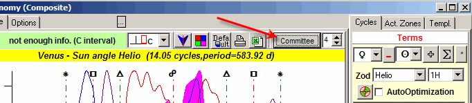 The same manner you can apply committee technique for astronomical cycles ("Astronomy" button). For example, working with 20 years price history we need to figure out how Venus synodic cycle works. The period of Venus synodic cycle is 563 days. To get committee for this cycle we calculate this cycle using last 642 days (a bit more than one Venus synodic cycle),1500 days, 9.6 years and whole 20 years of price history. To calculate the committee for astronomical cycles use this button: