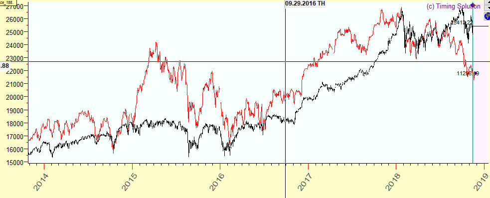 The black chart is DJII, while the red is for DAX. As you see, they definitely correlate. This becomes more obvious if we draw these charts in a smaller scale: