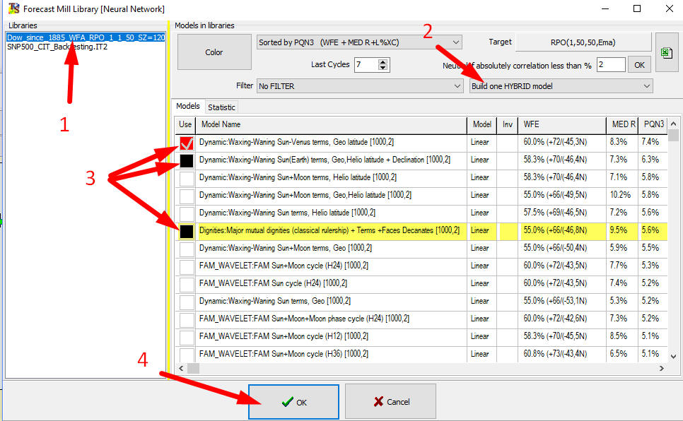 Here we select several NN models (3 in the example) combining them into one hybrid NN model that covers geo and helio latitude, declination and astrological dignities.