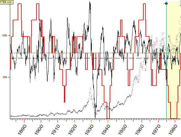 Here I used the reconstructed monthly price history for Dow from 1789 year provided by Bill Meridian.