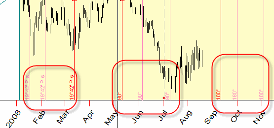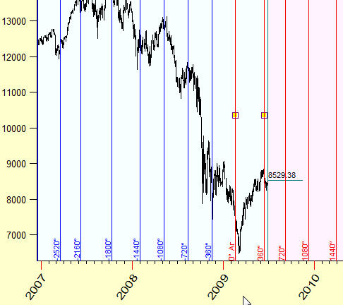 The program will display the longitude of our planetary picture together with the price chart. As you see, in the end of January 2008 the longitude has been the same as for our anchor data, March, 17 2008. It was caused by retrograde motion of one of the planets involved (Mercury in our case).