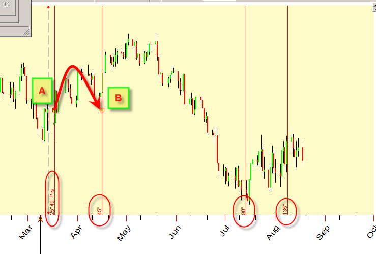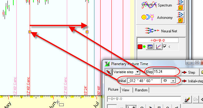You will see the bunch of vertical stripes. The first (point A) vertical stripe is our initial point; here the program indicates that the coordinate of Sun+Mercury-Venus point is 25degrees 49 minutes of Pisces. The second stripe (point B) shows the angle separation between A and B points, I set it to 45 degrees. It means that the longitude of our synthetic planet is increased on 45 degrees. Next vertical stripe corresponds to 90 degrees increment (2x45); the next is 135 degrees (3x45).