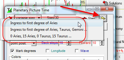 Example #2: We want to display the moments when Sun+Mercury+Venus+Mars+Jupiter+Saturn picture ingresses the first degrees of Aries, Taurus, Gemini .. .Pisces.