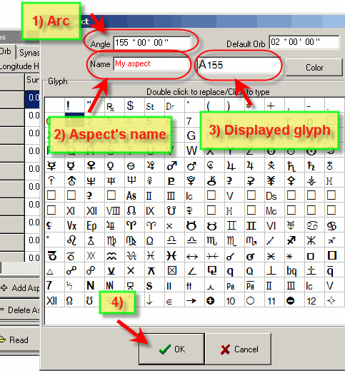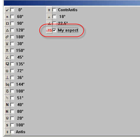 Say you create aspect "My aspect", angle separation is 155 degrees, it is displayed as "A155".