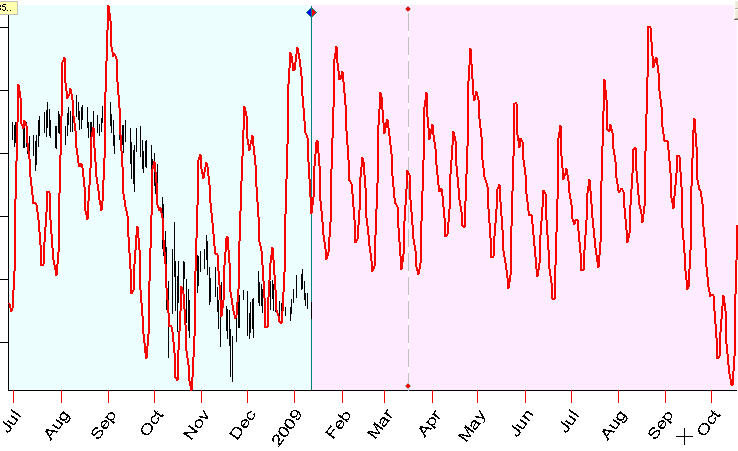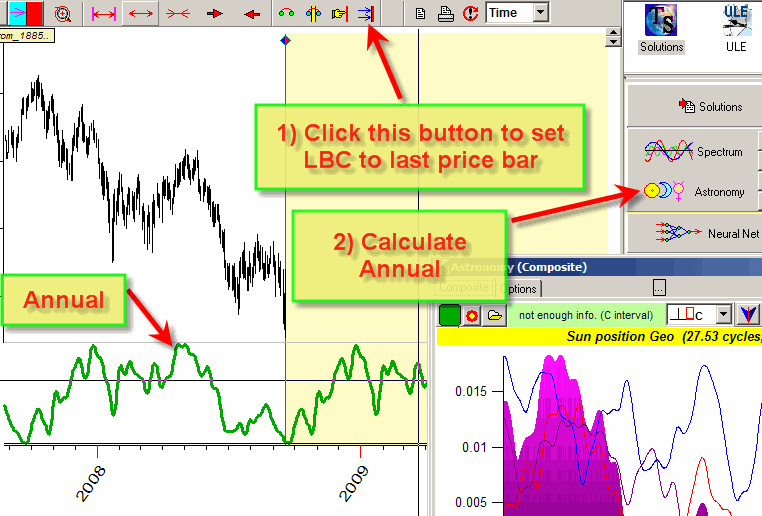 Usually the program uses all available price history to calculate the Annual cycle. For example, you have downloaded 20 years of price history. All this price history (before LBC) will be used to calculate this Annual cycle. However, you may have some insight that the Annual cycle for the last 10 years works differently than it has worked 20 years ago; thus you need only last 10 years of price history to calculate this cycle. In this case apply multiframe technology; in "Options" set stock memory=10: