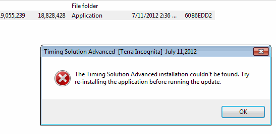 It means that Timing Solution is not installed on your computer or the installation is not completed. You should run installer first (through User Area) and after that install the upgrade: