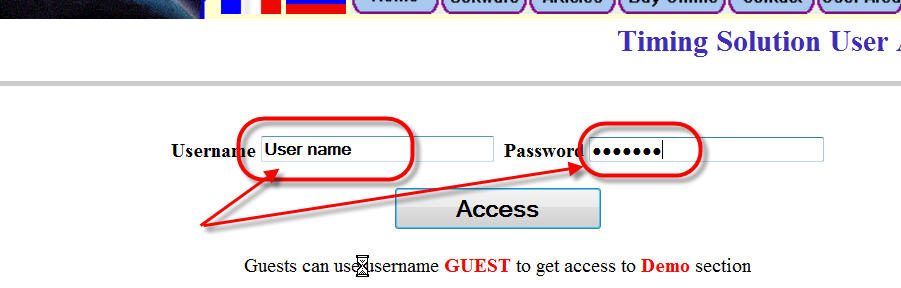 Open http://www.timingsolution.com website and click "User Area" menu: