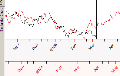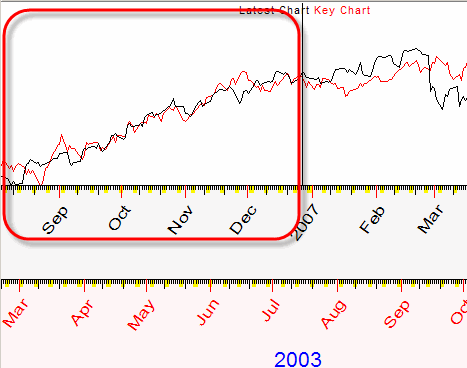 Also, you will see the list of Key Charts. Look at it. Each record has the ending date of the similar pattern of the price chart, the correlation between the two and the time lag parameter (i.e. how many days ago the similar pattern took place). You can highlight any Key Chart in the list to see it together with the analyzed chart. On the example below, the Key Chart ends on March 31, 2003 which has occurred 1803 days ago ("Time Lag" parameter):