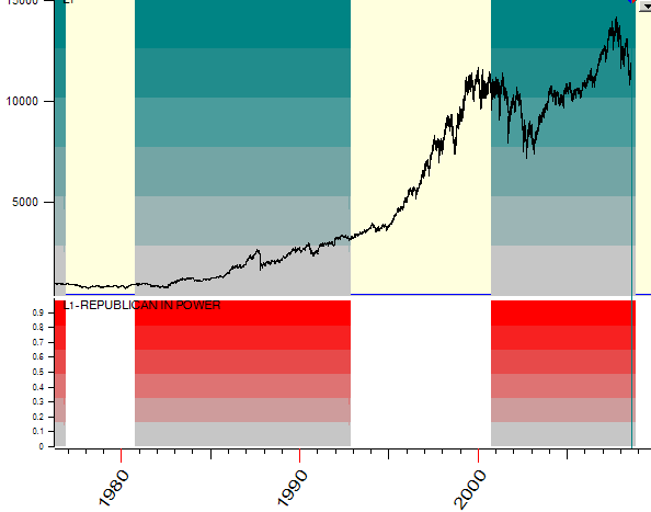 The program will show you the periods when Republicans have been in power for the chosen interval, together with the price chart:
