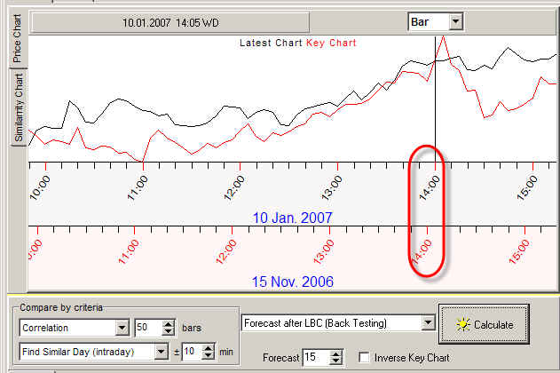 In this example the LBC is set to the end of December 2007. Thus the program is looking for similar patterns among the pieces of the price chart from August 2007 till the end of December 2007.