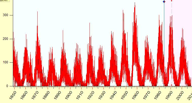 There is one interesting fact related to the sunspot activity. It was very low in the second part of 17th century. This period is called Maunder Minimum (1645-1715). It coincides with Little Ice Age, it was period of weather cooling.