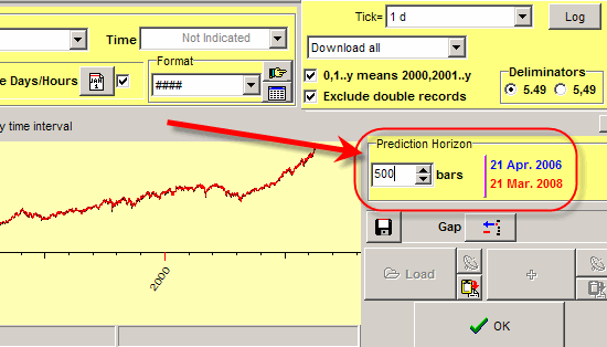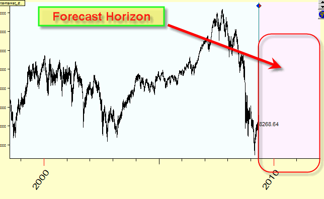 In other words, if you download daily Dow Jones data with the last available price bar as of June 3, 2009 and set Forecast Horizon to 500 (i.e. 2 years), the program will use data till June 3, 2009 to forecast the price movement for two years ahead starting from that day, June 3, 2009, and ending in June 2011.