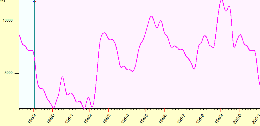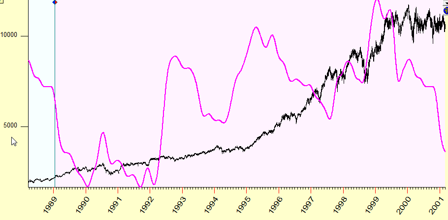 So we can imagine this situation: the forecast based on Jupiter cycle has been made 20 years ago, in the year 1989. A person who made it did what we all know: he downloaded all available at that time price history for Dow (since 1885 till 1989) and got this forecast::