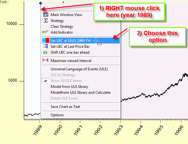 The LBC is the border between the past (this is what we know) and the future (that we do not know yet). In other words, the program "does not know" the price movement after LBC. We can conduct this imaginary experiment with one mouse click and see the forecasting ability of the analyzed cycle, just imagine yourself investing your own money in 1989 based on this projection line.