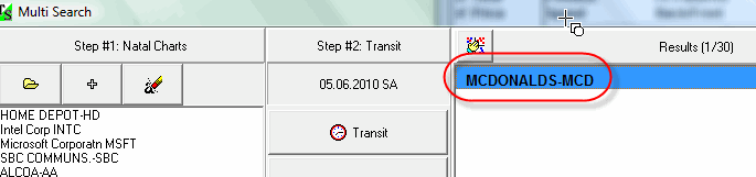 Example #1: Analyze all Natal Charts that form 30 Blue chips for Dow Jones Industrial Index and choose those that have MAXIMUM amount of "good" aspects today (|December 4, 2009). As a "good" aspect, we take here sextiles and trines. This is the result provided by Multi-Search module for this example: