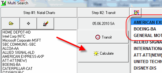 The program chose three the most aspected Natal Charts (Amex, Boeing and GM). Highlighting any of these Natal Charts, you can see all aspects that affect this chart.