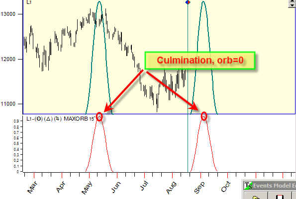 This diagram shows as well the strength of this aspect starting from the wide orb=15 degrees to culmination:
