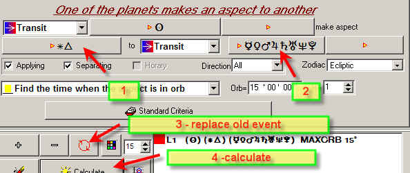 You will get the Model Editor window where you can define easily practically any astrological event. Let it be the event: "the Sun makes a trine to Jupiter with the orb=15 degrees".
