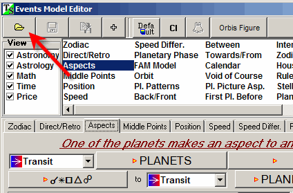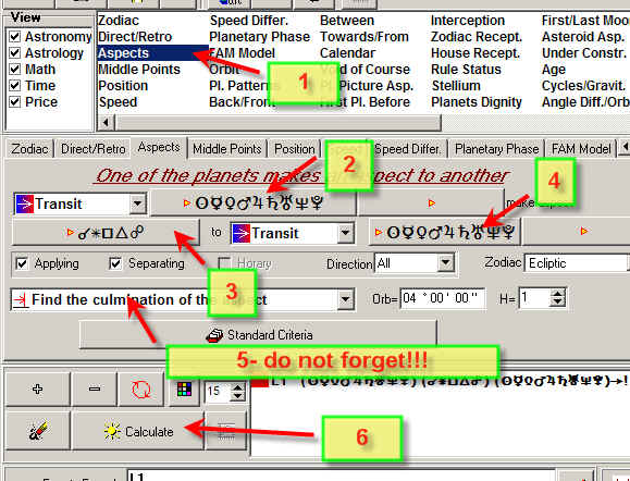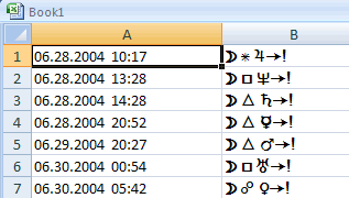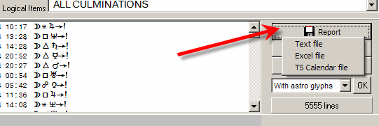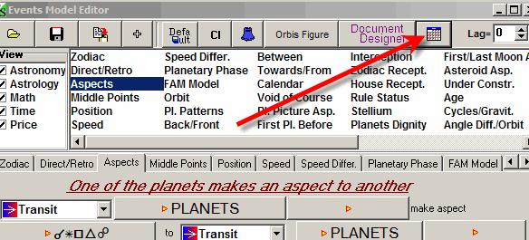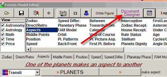 In previous example we have created a list of aspects culminations. Now let's create more detailed table with aspects, ingresses, direct/retrograde and midpoints.