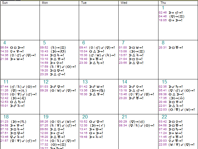 or a calendar of all events (aspects, ingresses, midpoints, direct/retrograde), like this: