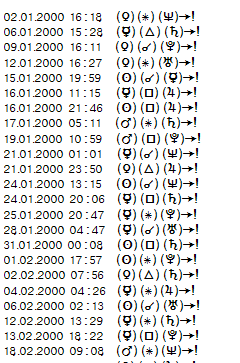 Important: if you save this file and plan to browse it later using Notepad, Word or any other program, do not forget to set AlmaFont font to see the astrological symbols.