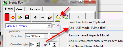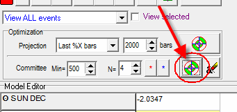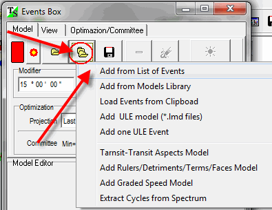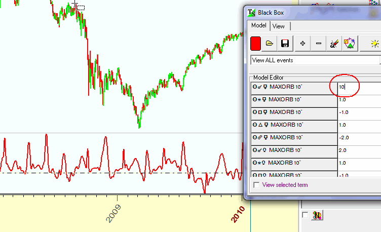 Events Box module allows to design astro based models manually. In Timing Solution there are modules that generate the projection line automatically; they analyze past price history, select automatically the events that play a significant role and assign the most optimal weights for analyzed events. These modules are: Neural Network, Bradley Barometer, Composite.