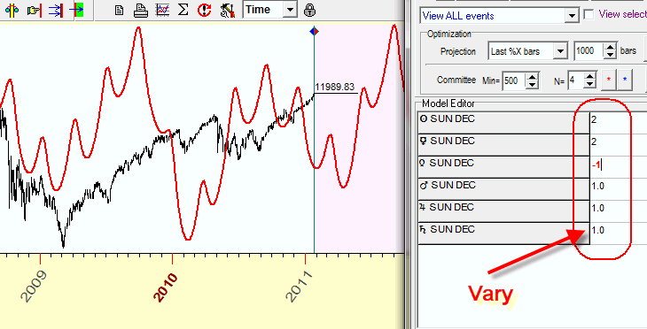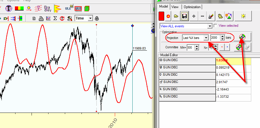 Here we used last 2000 bars to adjust the projection line, in other words the program is looking for the optimal weights for heliocentric declination using last 8 years of the price history (=2000 bars).