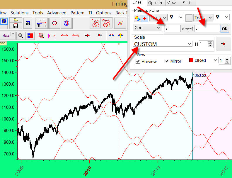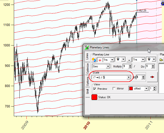 There are controls there that allow to choose the planetary combination. Scale is another very important parameter for planetary lines technique; in the example above we used a scale 1 degree=$1. If we consider Dow Jones index which varies now around 10,000, the more suitable scale is 1 degree=$10. Also it is better to use higher scale for slow planets: