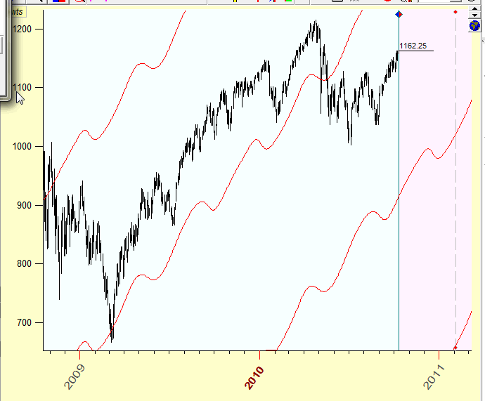 Look at the Sun planetary line. Within one day, the Sun travels approximately 1 degree, it comes to 360 degrees within one year. When creating its planetary line, we assume that 1 degree of the Sun travel corresponds to $1 of price changes. On March 21st, when the Sun ingresses the first degree of Aries. these lines indicate these price levels: $0, $360, $720, $1080 etc. Thus we see here the bunch of planetary lines shifted on $360: