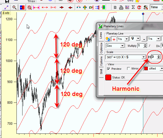Harmonic number is one more important parameter. In the example above, to display the bunch of planetary lines the angle separation 360 degrees is used. We can vary this parameter; if you set Harmonic=2, the density of planetary lines will be 180 degrees ($180 in our example). Harmonic=3 corresponds to 120 degrees; here it is: