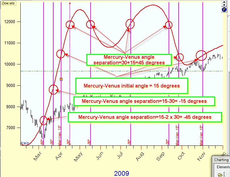 Just to show you how it works, let's consider Mercury-Venus planetary equidistant lines with the initial angle separation +15 degrees and the step=30 degrees: