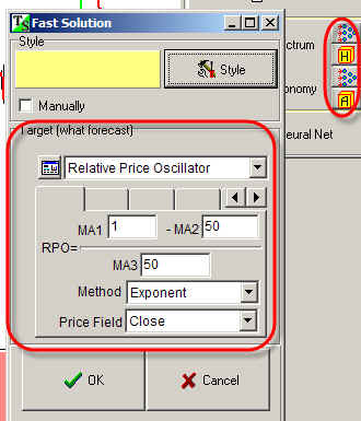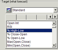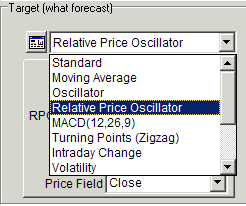 Timing Solution allows to forecast different indicators. It means that though you download the price history, you can make a forecast not for the price only. Option traders are more interested in forecasting volatility, and you can make a forecast for volatility or for true rang (the difference between high and low). Some users are more interested in forecasting ADX index (average directional movement) to figure out the trend's continuation perspective. It is possible to do all these things with Timing Solution. You can do it through "Target".