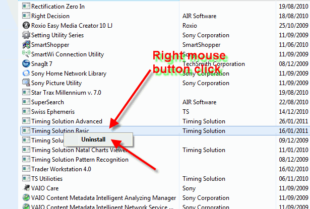Step #4: wait a bit and highlight "Timing Solution Basic" item (or "Timing Solution Advanced" if you want to delete Advanced version), click RIGHT mouse button and choose "Uninstall" item:
