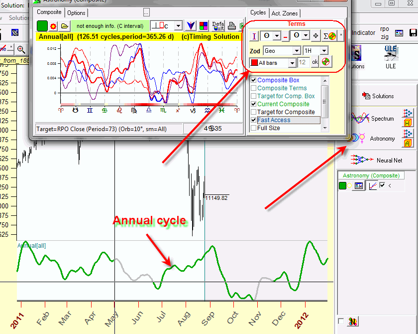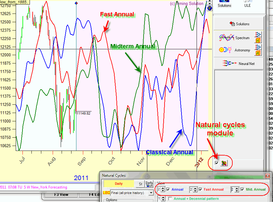 Here Last 20 cycles parameter is defined, so the program uses last 20 years of price history to calculate this Annual cycle (20 years is not just a number; this is another economical cycle, Kuznetz cycle), i.e. we can see how Annual cycle reveals itself within the last 20 years.
