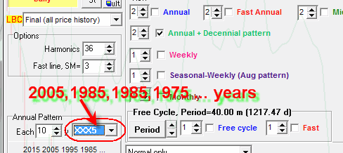 In decennial cycle we used XXX1 year pattern. The decennial cycle is a trace of a theory that market patterns tend to repeat themselves in regular intervals (10 years in our example). This theory opens a lot of possibilities. Let say that we think that patterns repeat themselves every five years, starting backwards from 2010. In this case, we will look for analogies (similarities) between 2010 and 2005, 1995, 1985, ... years. To calculate XXX5 patterned cycle in "Natural cycles" module, set this parameter: