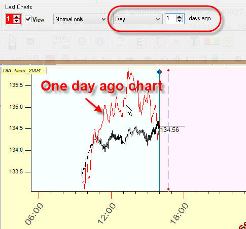 For intraday: one day (calendar day) ago price chart: i.e. display the price chart one day ago overlaying the current chart:
