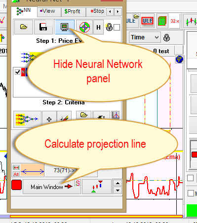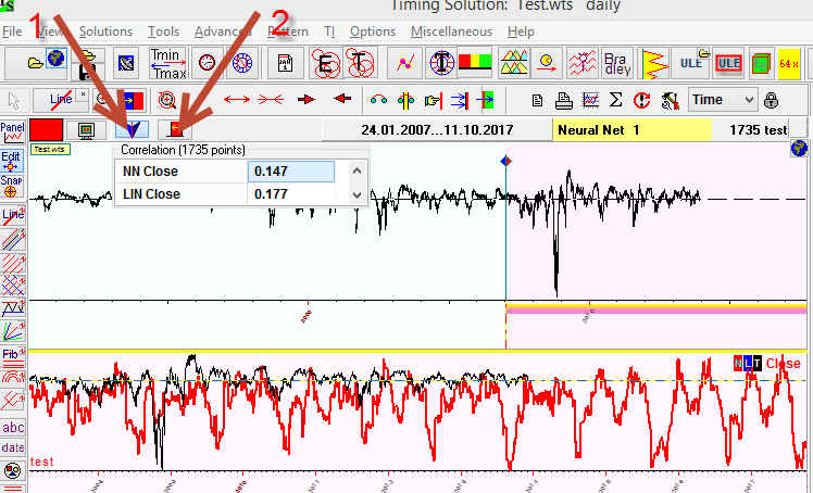 In this example I've highlighted the interval that covers years 2011-2013. We see how Neural Network projection line (red) forecasts the retail breath index (black) and see the correlation coefficient of the price and the projection line. You may use this table to estimate the quality of your projection line: