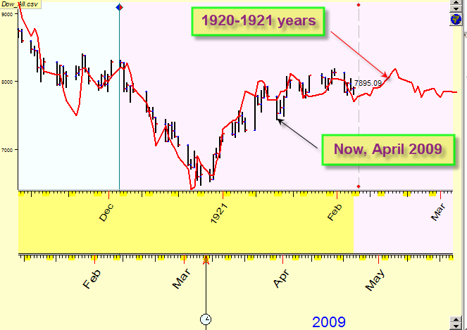 The black one is a current chart while the red curve is Dow Jones Industrial index price chart for the years 1920-1921.