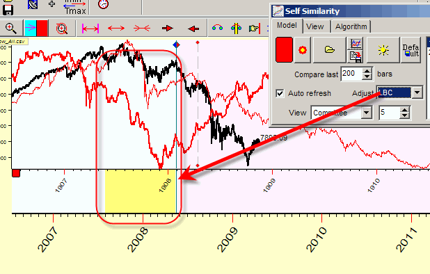 The program starts working in the "self similarity" mode. Instead of comparing different price charts (like Dow and Crude Oil), it is looking for the similar patterns using only the downloaded price history.