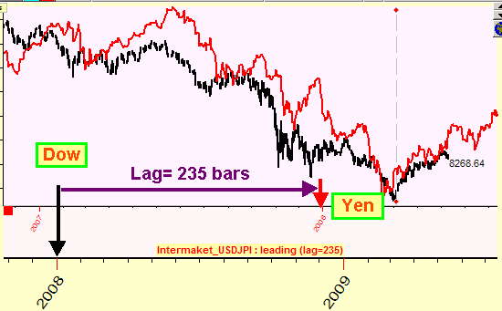 As an example, see the diagram of Japanese Yen shifted to 235 bars ahead in respect to Dow (they are shown together: black - Dow, red - shifted Yen):