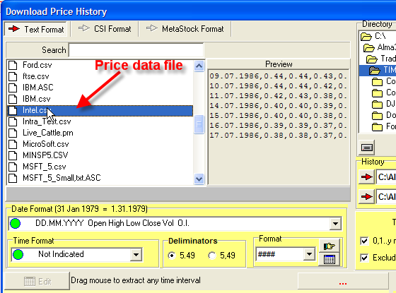 Choose one of the files, and the program automatically finds the appropriate format for this text file. You can use any price data files with *.csv, *.txt, *.prn or *.asc extensions.